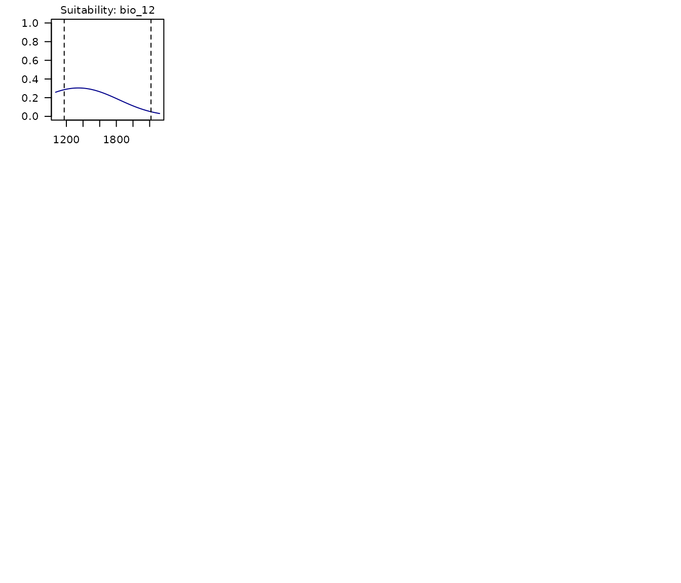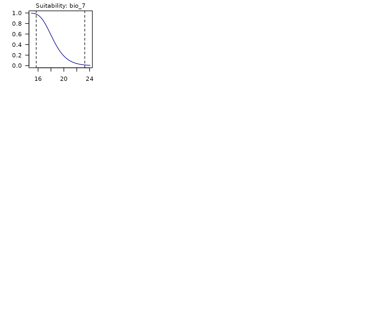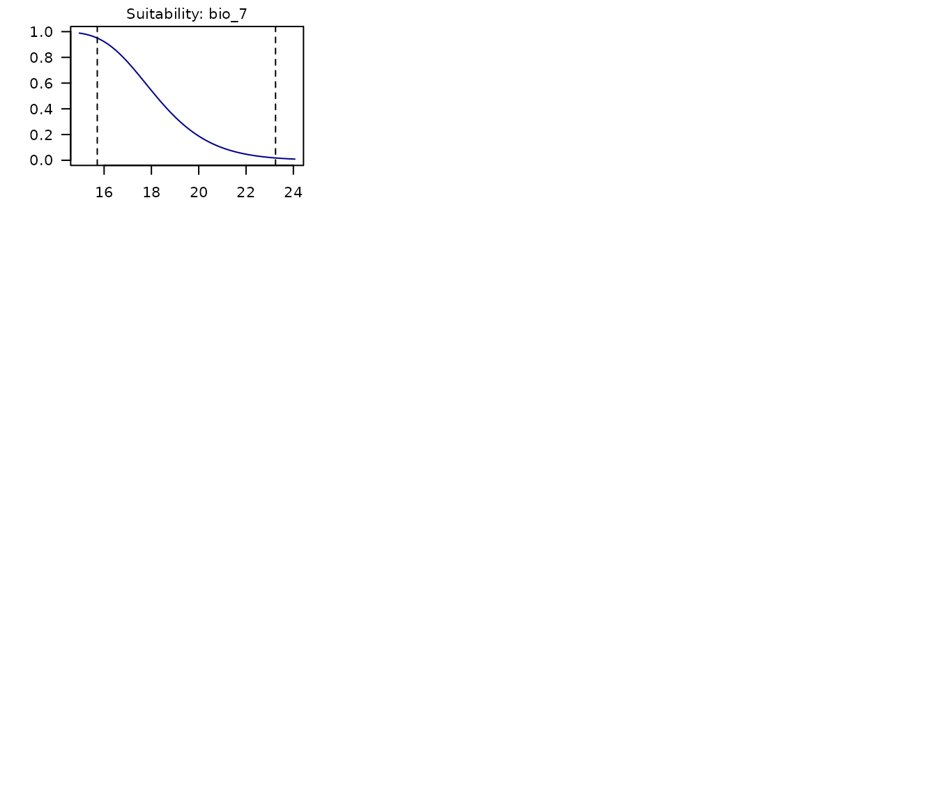 - Dashed lines representing the limits of the environmental values in the data used to fit models.