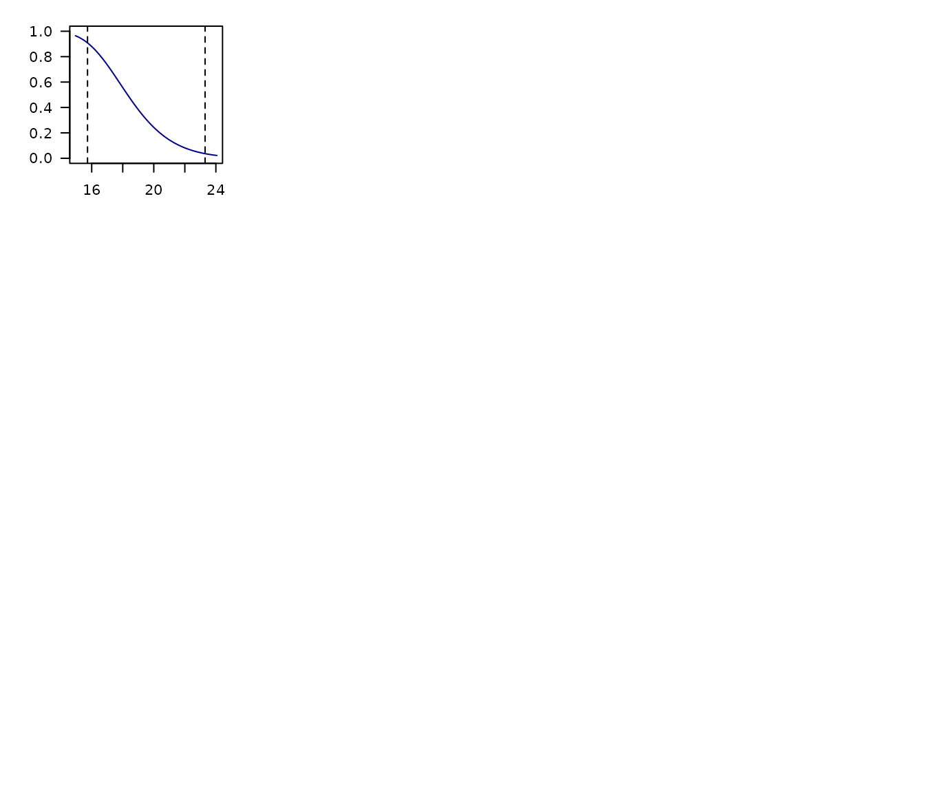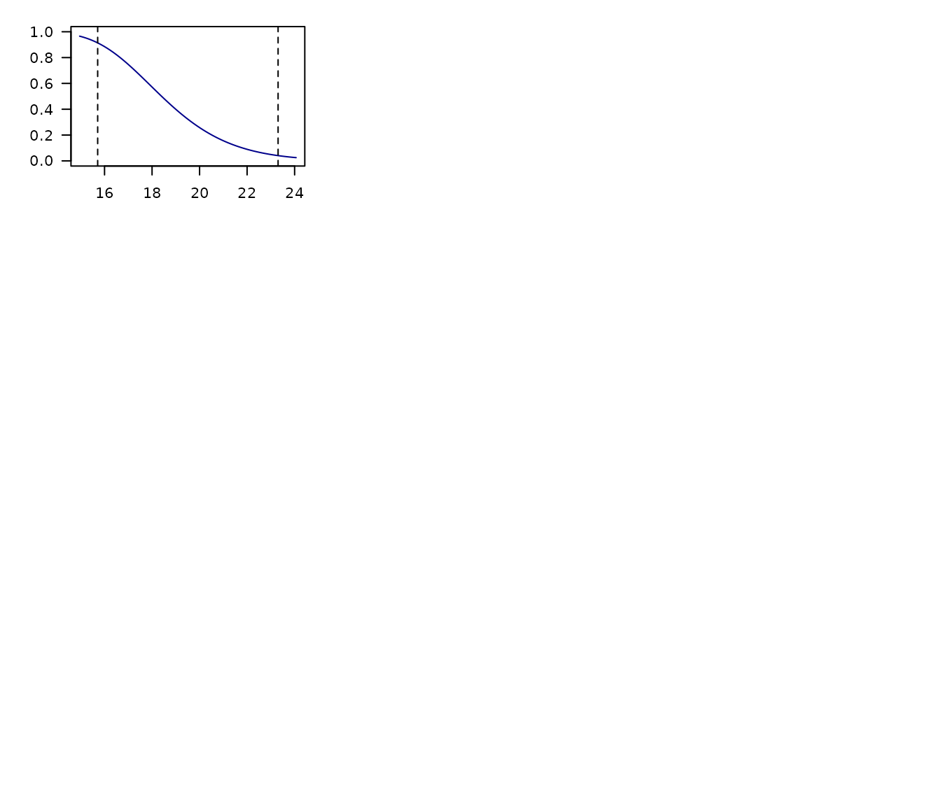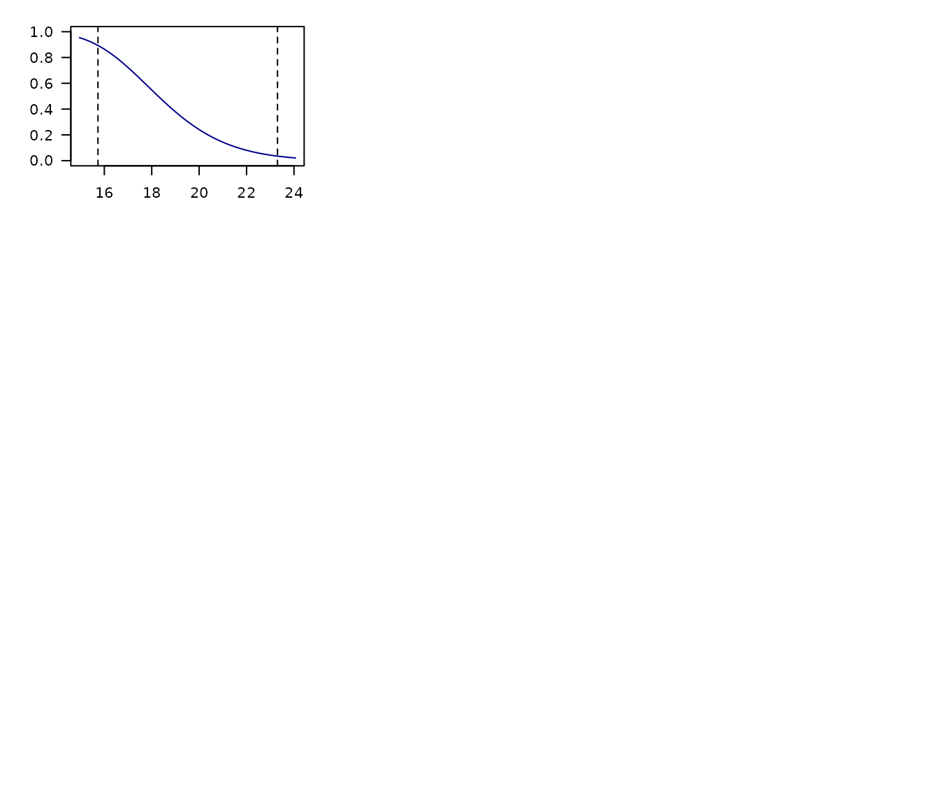 - Dashed lines representing the limits of the environmental values in the data used to fit models.