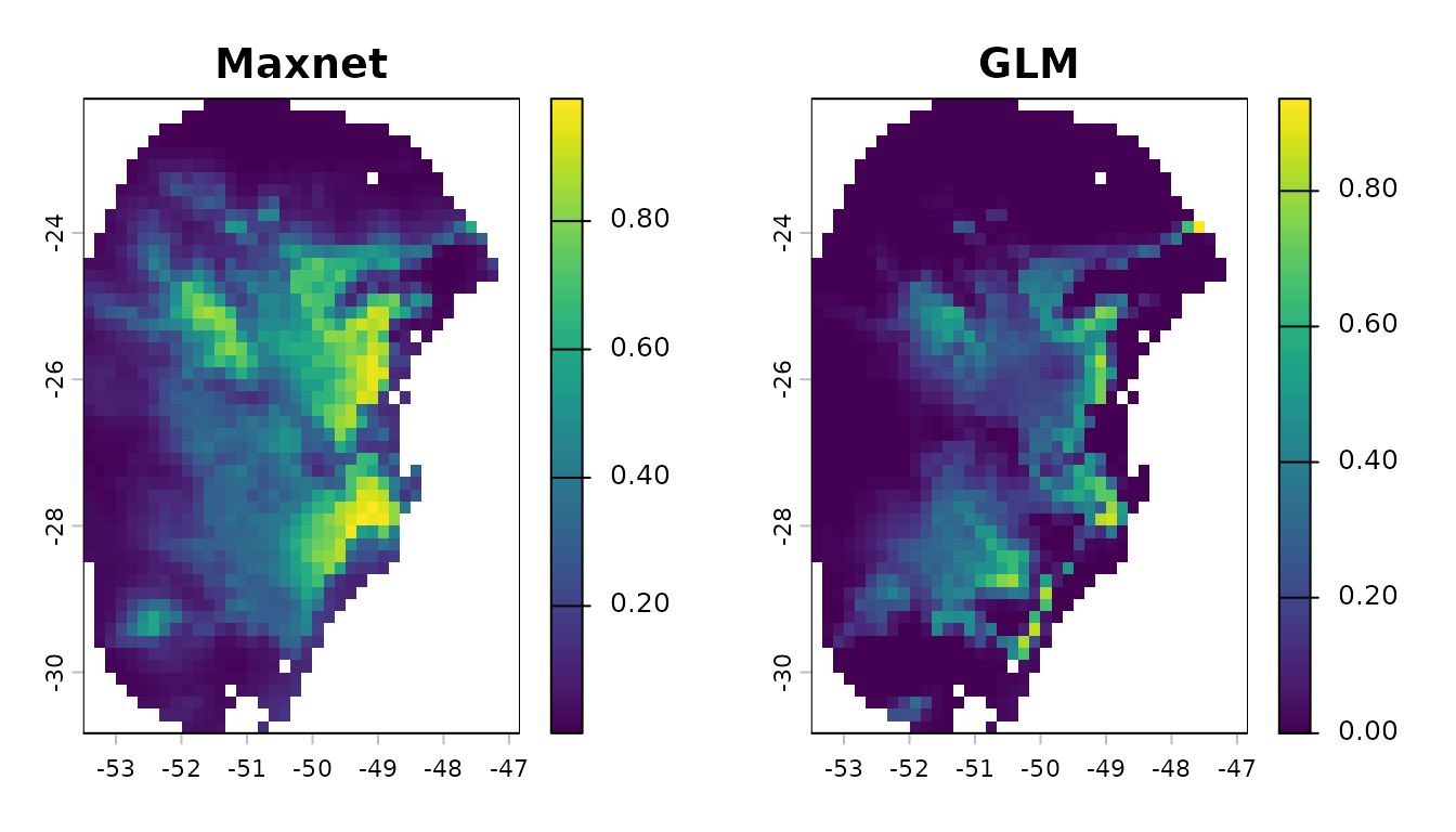 #> [1] 10In both models, a 10% omission error rate was used to calculate the thresholds. This means that when predictions are binarized, approximately 10% of the presence records used to train models will fall into areas classified as unsuitable.