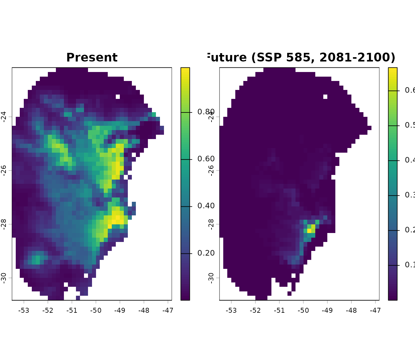 main = c("Present", "Future (SSP 585, 2081-2100)"))