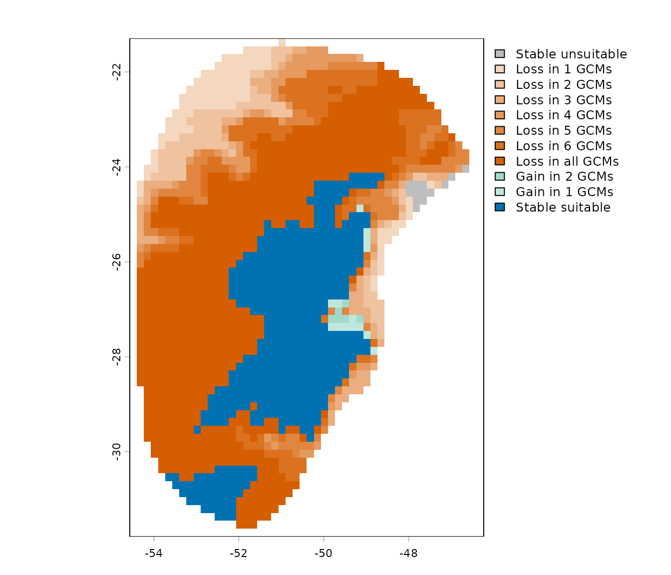 When projecting a model to different temporal scenarios (past or future), changes in suitable areas can be classified into three categories relative to the current baseline: gain, loss and stability. The interpretation of these categories depends on the temporal direction of the projection.