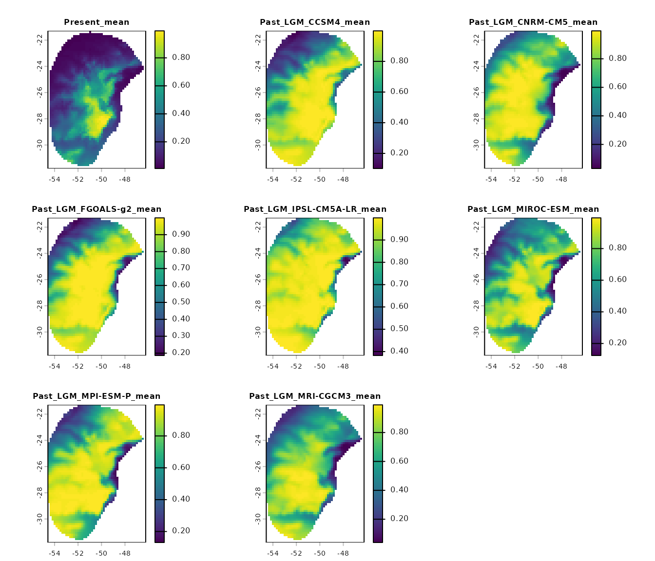 Organizing information this way can be a little tedious, but here we will show how to do it. This will make possible to project models using scenarios available in different sources. We will use variables from CHELSA representing scenarios for the Last Glacial Maximum (LGM, ~21,000 year ago).